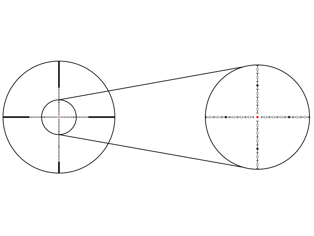 Прицельная сетка 61 (Half MD), расположенная во второй фокальной плоскости (SFP), с увеличением кратности остаётся неизменно тонкой. При этом угловые размеры сетки пропорционально изменяются.